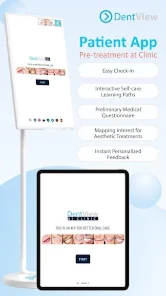 DentView AI Clinic, klinik ziyaretlerini daha etkili hale getiren bir sağlık ve yaşam tarzı uygulamasıdır. Hastalar, randevularından önce, sırasında ve sonrasında kişiselleştirilmiş yollar izleyerek etkileşimli bir öz bakım öğrenimi deneyimi yaşarlar. Klinik profesyonelleri ise zaman tasarrufu sağlayan akıllı iş akışları ile desteklenir. Uygulama, tablet veya kiosk gibi cihazlarda kullanılmak üzere tasarlanmıştır ve 40,000'den fazla hasta oturumu ileortalama puana sahiptir.